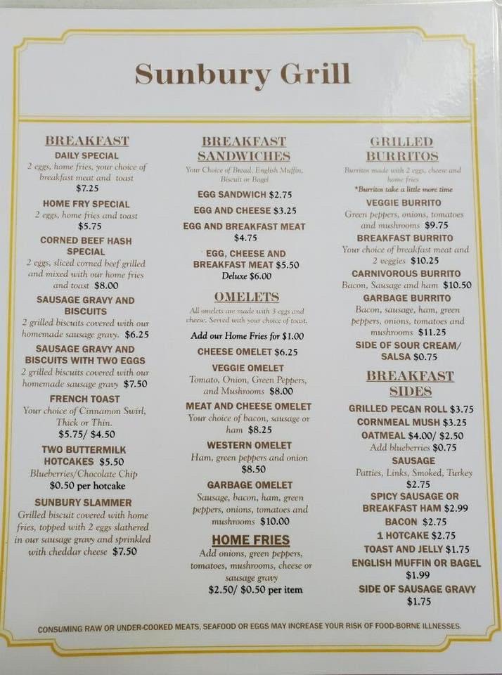 The Sunbury Grill offers a straightforward and comforting menu that reflects the charm of a classic American breakfast spot. Its selection features hearty favorites and casual bites designed to satisfy morning appetites and midday cravings alike.